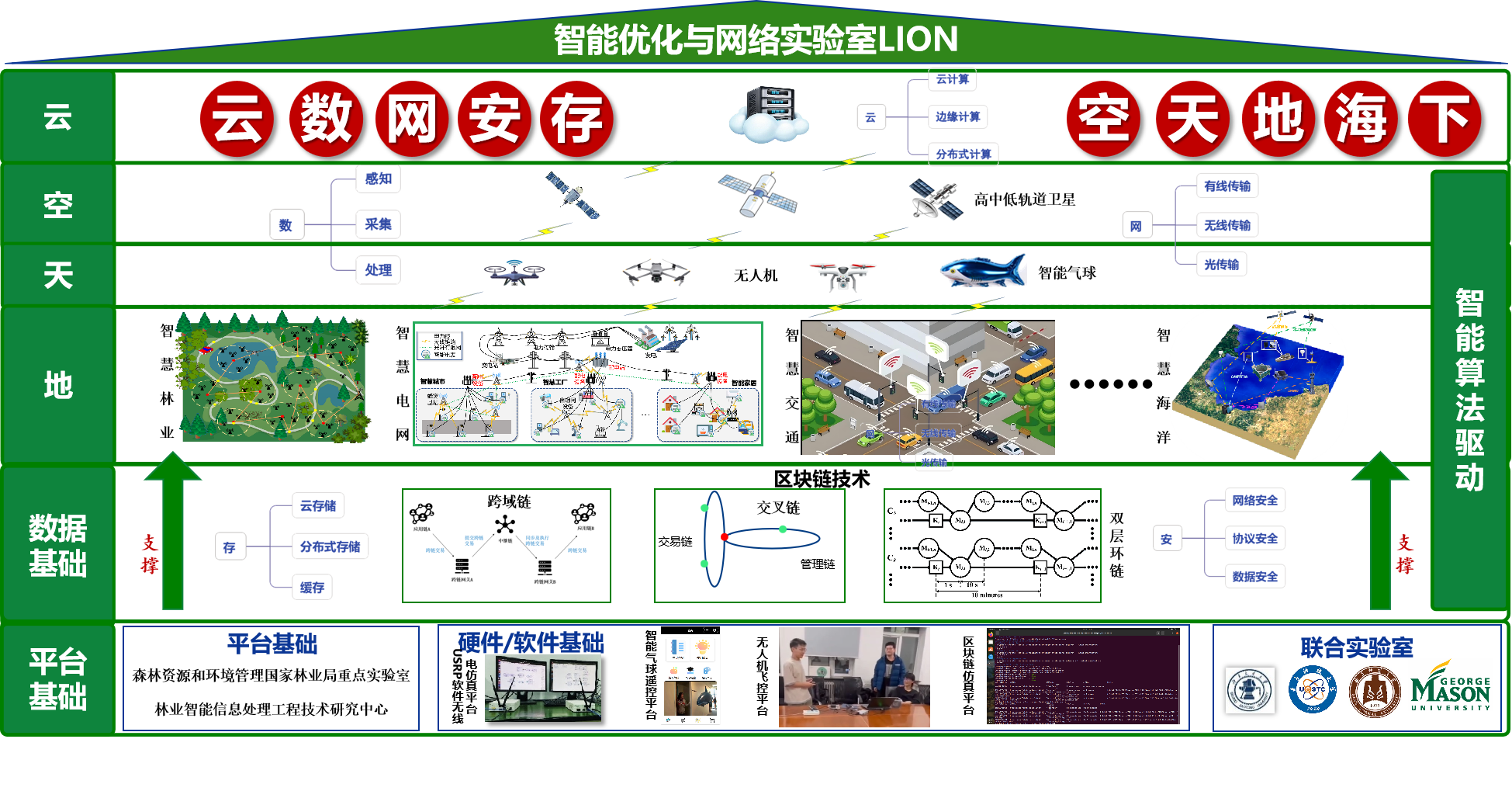 北京林业大学智能优化与网络实验室(Laboratory of Intelligent Optimization and Networks, LION) 隶属于北京林业大学信息学院(人工智能学院)。以围绕国家科技发展战略需求、服务社会发展的宗旨,在无人机(包括定位、避障、导航、三维空间重构等)、网络智能(包括边缘计算、联邦学习等)、物联网(数据采集、无线通信)、安全隐私保护(无人机安全、物理层安全、区块链)等方向开展研究工作。团队承担或参与了 国家自然科学重点/联合/面上/青年基金项目、国家重点研发计划课题、北京市自然科学基金、中国科协人才托举工程项目、中国博士后科学基金、美国自然科学基金等数十个项目,取得了一系列重要的研究成果。近年来,团队已在主流的国际期刊和会议上发表论文100多篇,包括 IEEE/ACM Transactions on Networking,IEEE Transactions on Wireless Communications,IEEE Transactions on Cognitive Communications and Networking,IEEE Transactions on Intelligent Transportation Systems,IEEE Communications Magazine等。